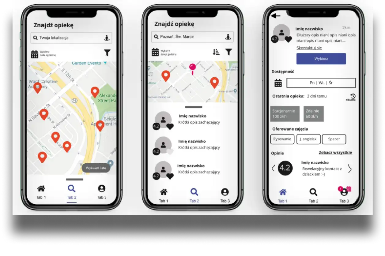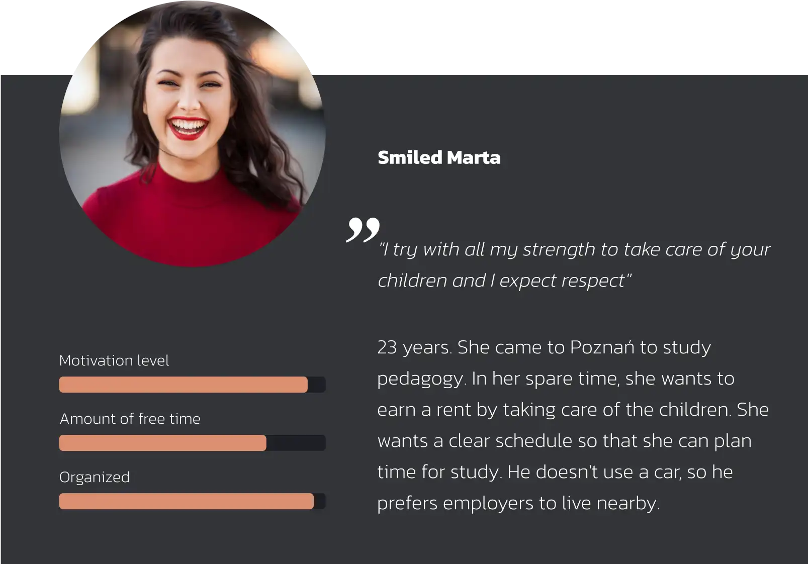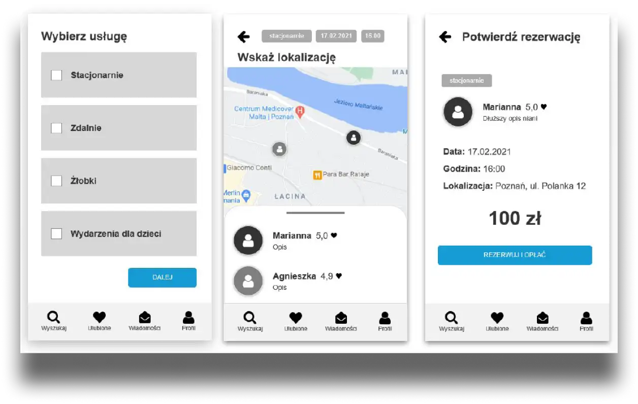 - możliwość rezerwacji wizyty "na już"; opieka nad więcej niż jednym dzieckiem; system poleceń niań
