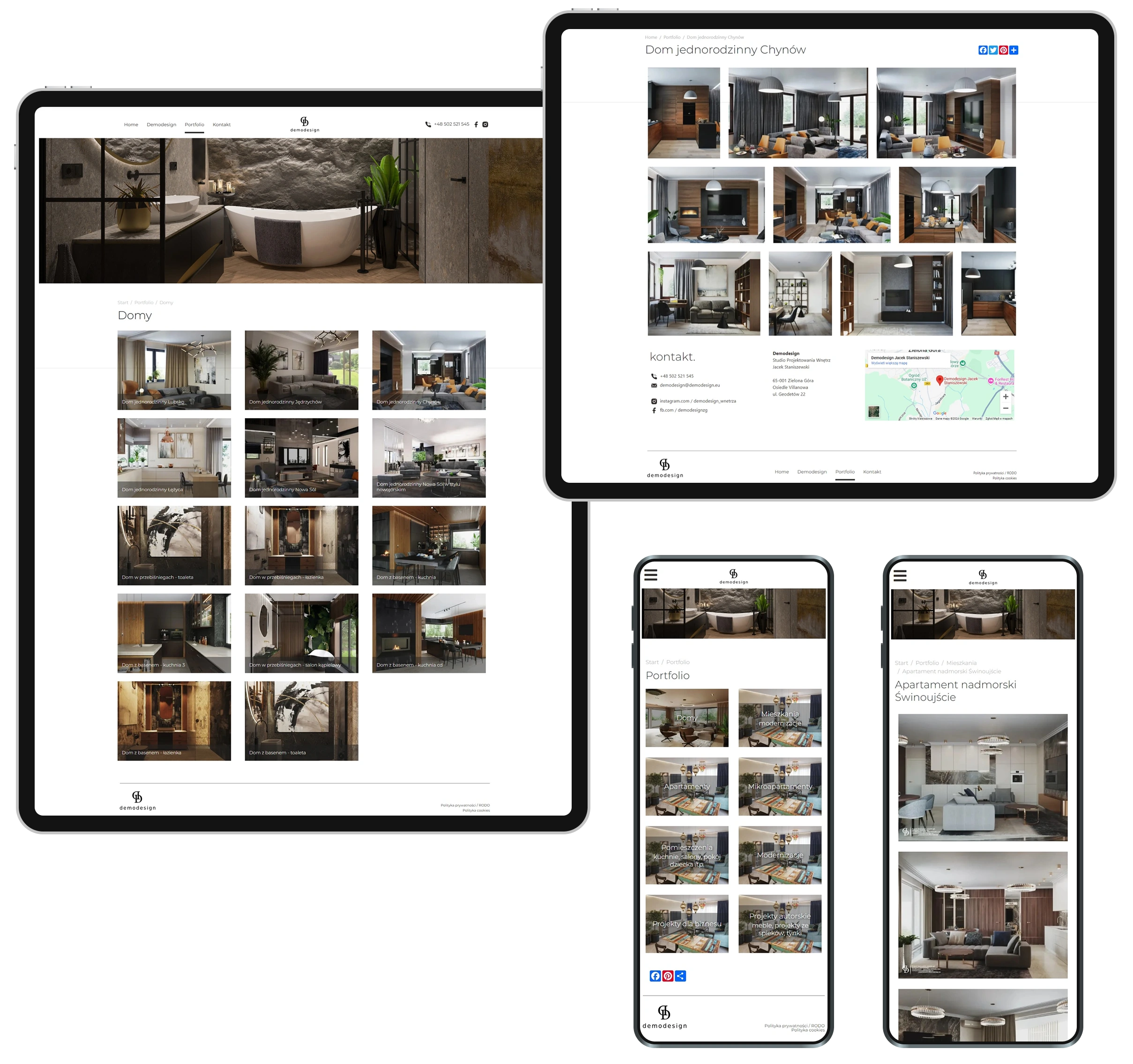 Demodesign's portfolio is divided into categories, each of which contains images of a completed interior design.